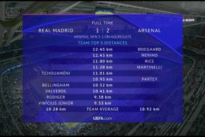 体育资讯4月17日讯 欧足联统计了阿森纳对阵皇马比赛球员的跑动距离,厄德高12.45公里第一。